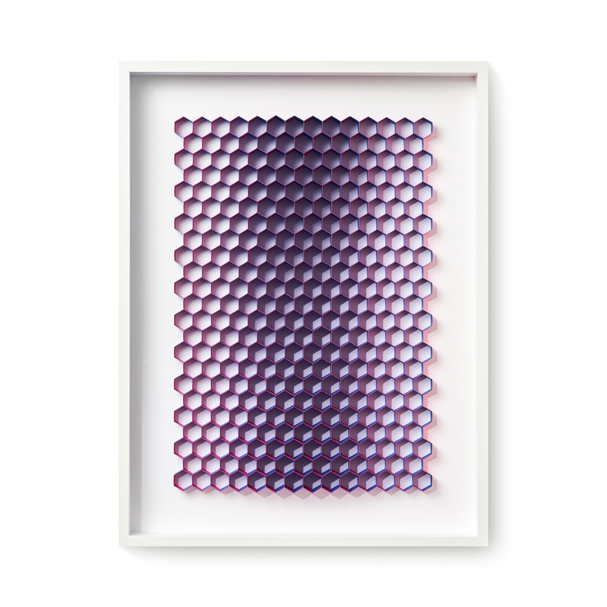 Each artwork is unique based on a set of shapes twisted masterfully into patterns, colours and shades. The design is firstly created as 2D and subsequently as 3D. After drawing the 3D design digitally, the various shapes are printed followed by the meticulous work of cutting. The last step in the process is bending each shape manually to the larger frame and glueing it all together to ensure the right 3D-effect. Once a work is completed, it is fixed with a custom made frame embedded with thick museum glass to protect the work.